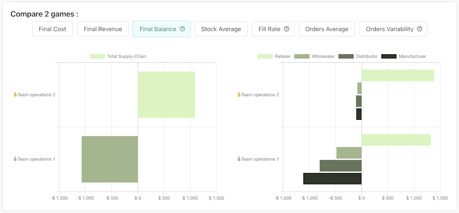 The beer game is more fun when several teams compete with each other. In order to select a winner (using the default settings), we calculate the sum of the Inventory and Backorder Costs. The winning team will have reduced both costs and, therefore, achieved just the right stock level at each stage — not too high and not too low.